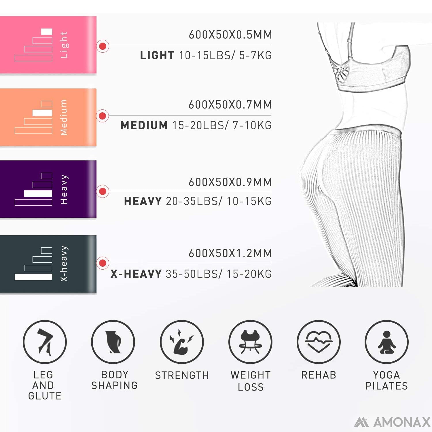 Amonax resistance bands workout have 4 different thicknesses, providing a wide range of resistance strengths. Amonax resistance bands workout also have added thickness, giving the bands greater durability to prevent snapping or rolling during exercises.