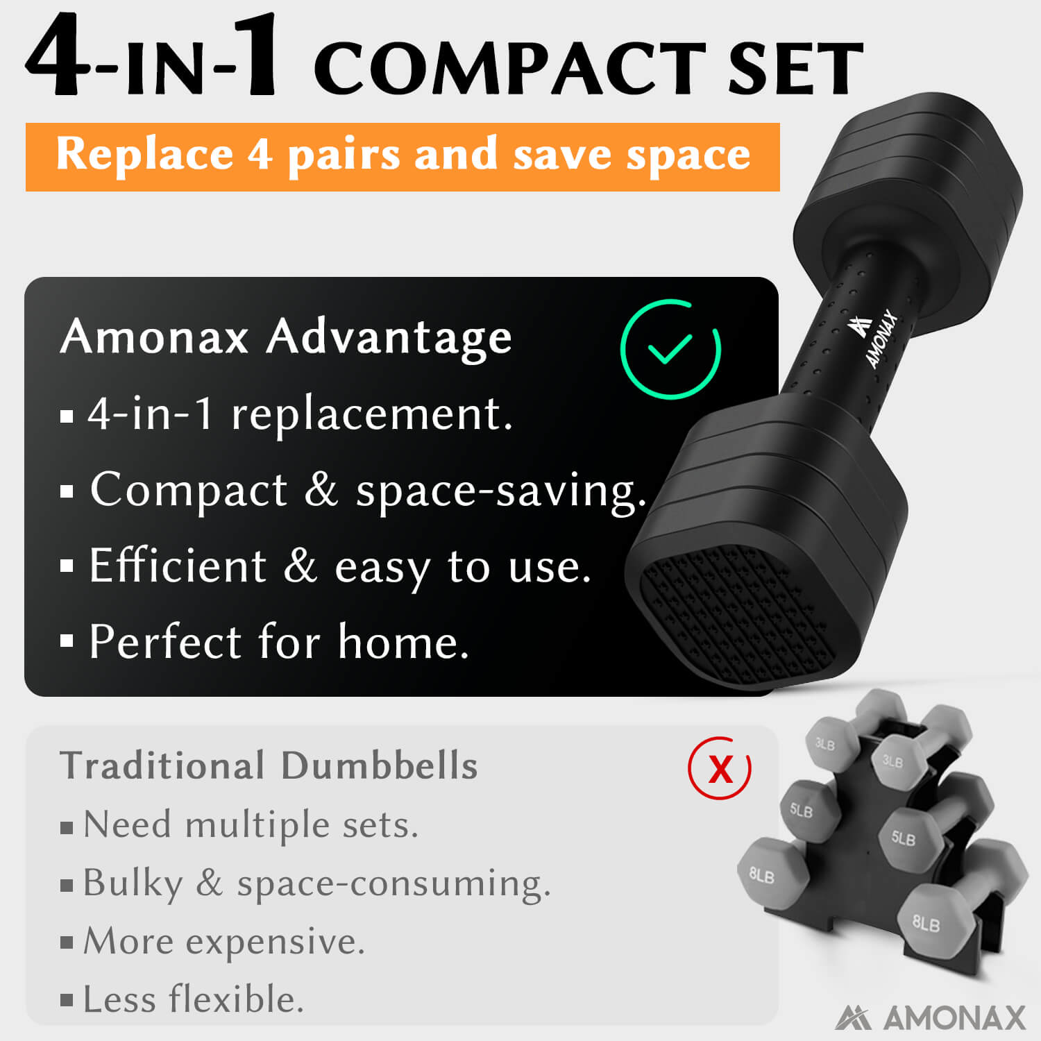 Amonax exercise weights for women replaces multiple pairs of dumbbells for women, offering a weight range from 2 lbs to 5 lbs per dumbbell. This exercise weights for women system allows for gradual strength progression, making it ideal for both beginners and experienced users.